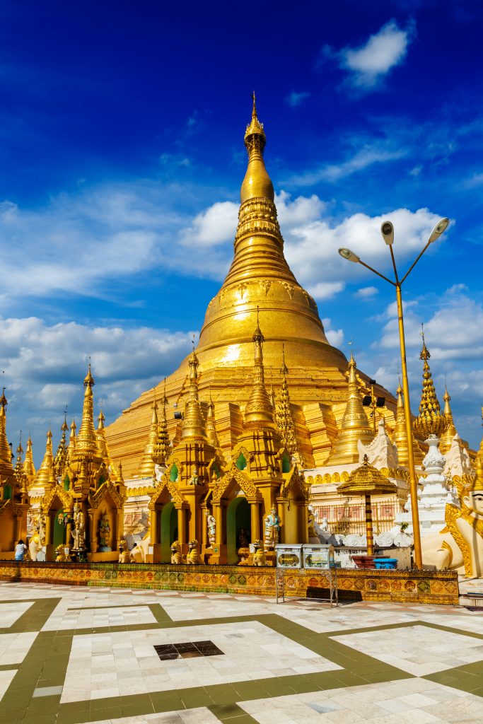 Coronada por una estupa cubierta de oro puro de 99 metros de altura, esta impresionante pagoda budista domina el horizonte de Yangon. El recinto, con sus numerosos templos, estatuas y santuarios, es un laberinto de colores, texturas y ornamentos que deslumbran a los visitantes. La pagoda, considerada una de las joyas arquitectónicas de Asia, es un símbolo de la fe y la espiritualidad birmanas.