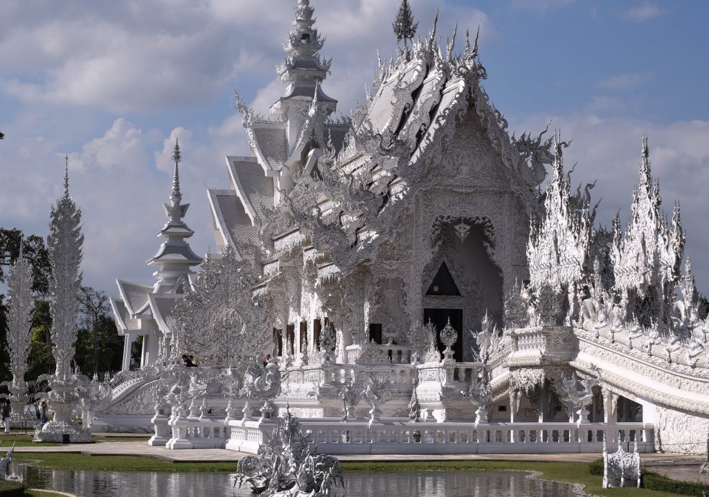 Este templo budista, también conocido como el «Templo Blanco», parece salido de un cuento de hadas. Sus estructuras cubiertas de cal blanca, con detalles dorados, se reflejan en un estanque que le otorga un aspecto etéreo y fantasmagórico. El complejo, diseñado por el artista Chalermchai Kositpipat, combina elementos tradicionales tailandeses con toques surrealistas y modernos.