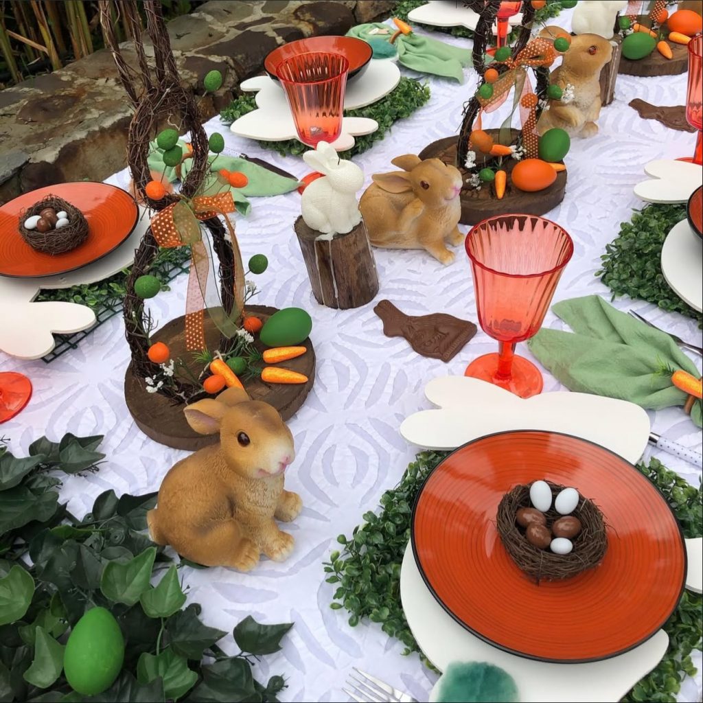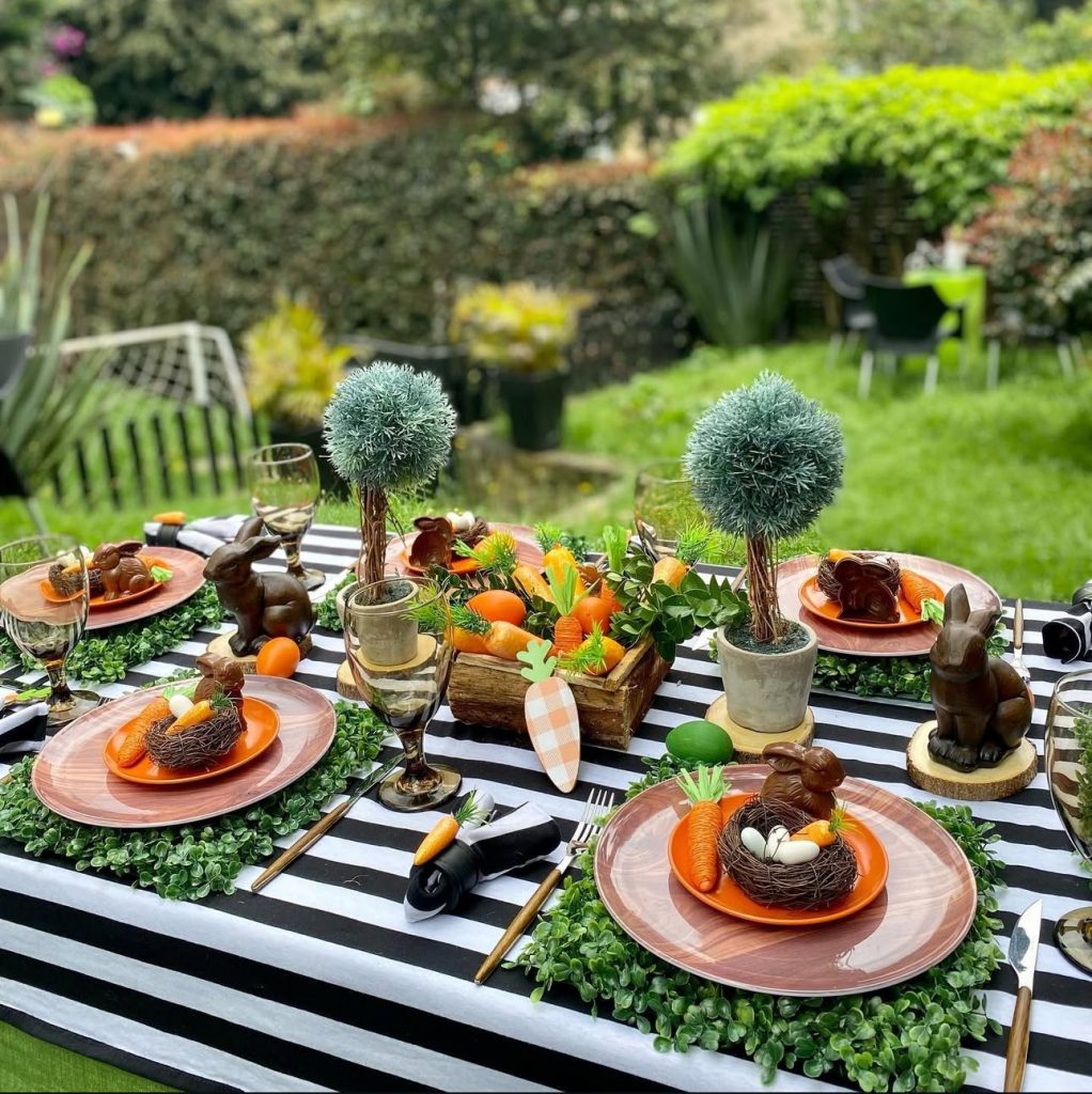 En esta ocasión, Betancourt nos deslumbra con una variedad de propuestas que abrazan tanto la suavidad de los tonos pasteles como la vivacidad de colores más intensos. Sus creaciones para la mesa incluyen arreglos que capturan la esencia misma de la temporada, utilizando para su decoracion desde pequeños nidos, hasta conejos de pocelana en diferentas tonalidades o en forma de chocolates, donde cada elemento ha sido cuidadosamente seleccionado para crear una armonía visual perfecta.